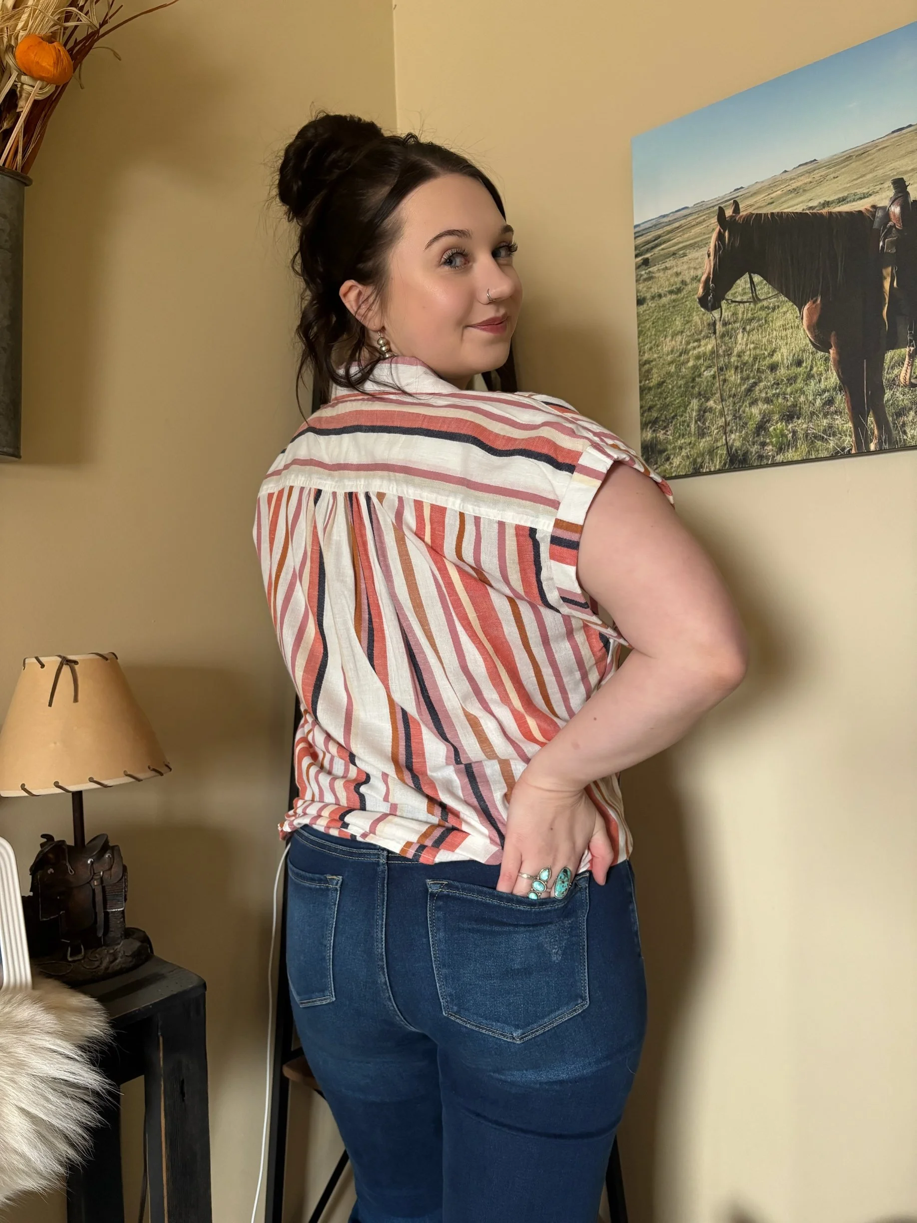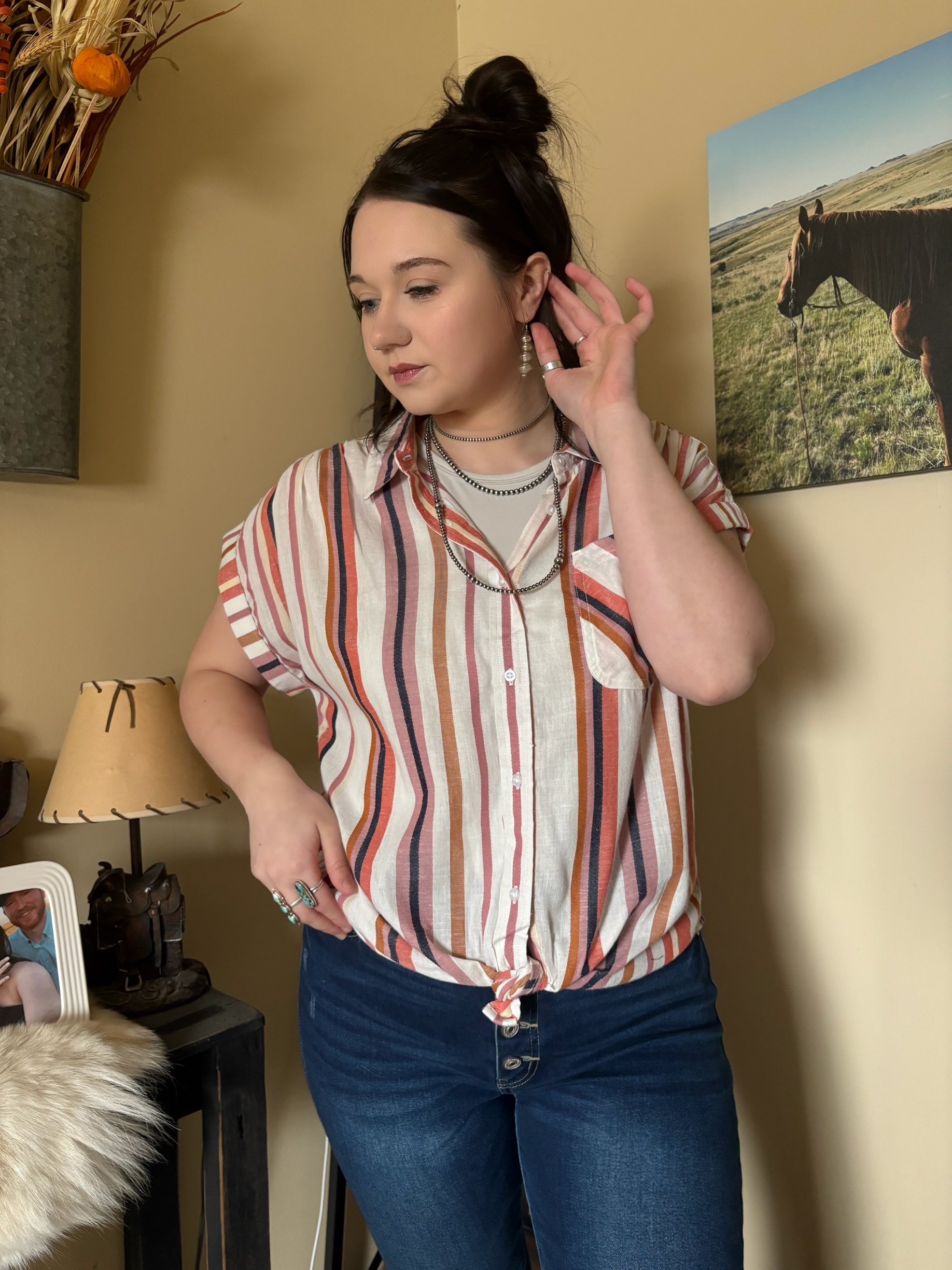 Meet the Desert Stripe Top — a breezy, flowy style with sunset-inspired stripes and a cute front tie. Perfect for that laid-back, golden hour cowgirl