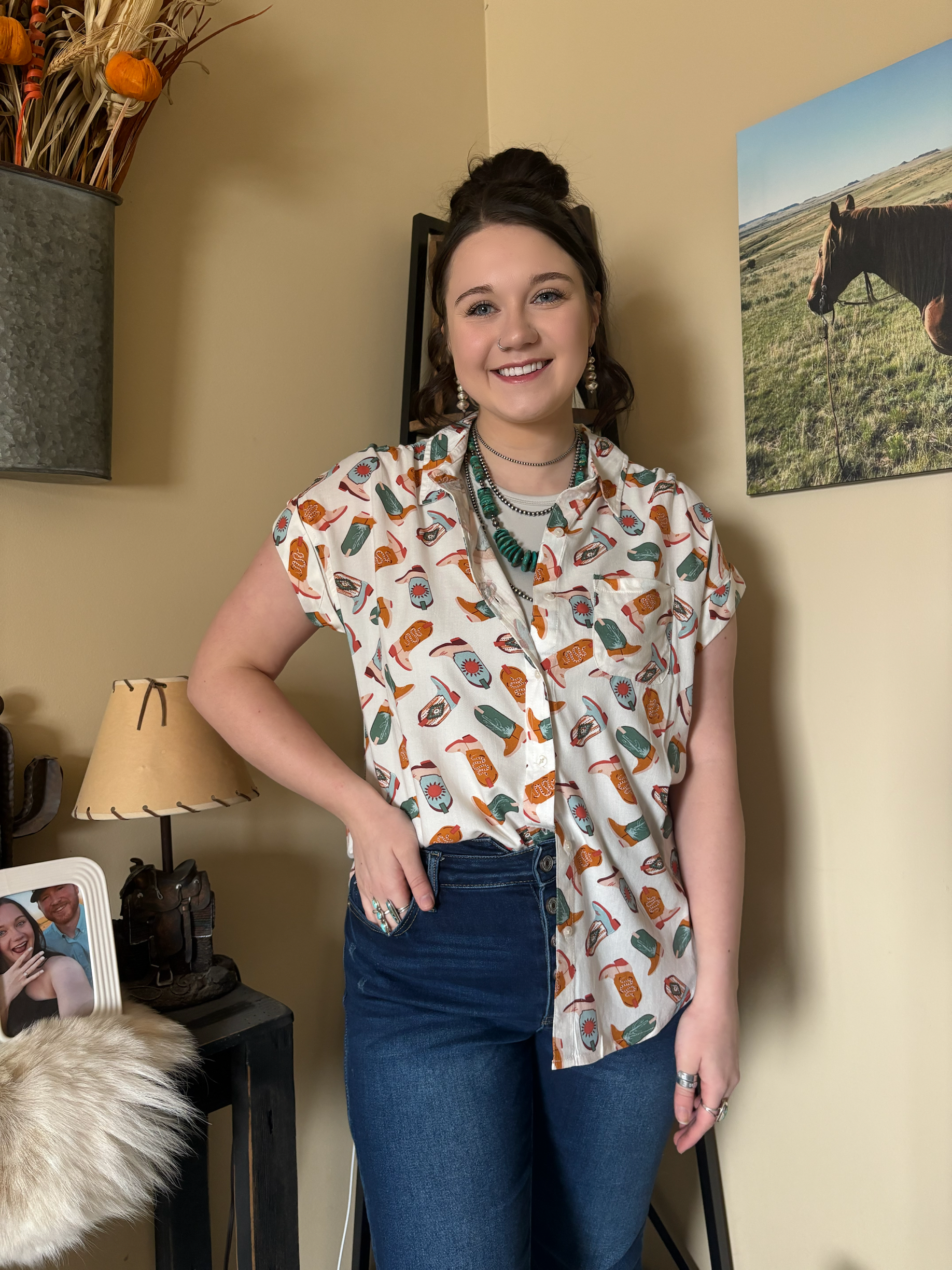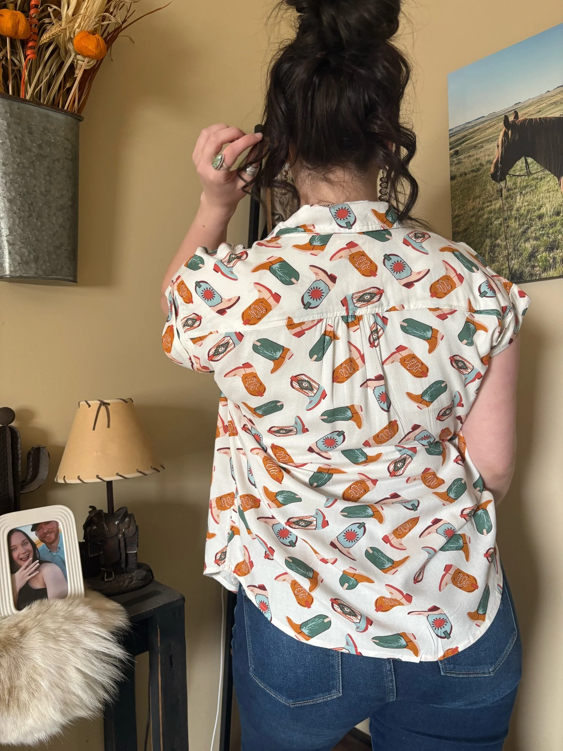 A breezy button-up with a fun boots + western print, the Boots & Blooms Top is made for easy, throw-on-and-go outfits all season long.